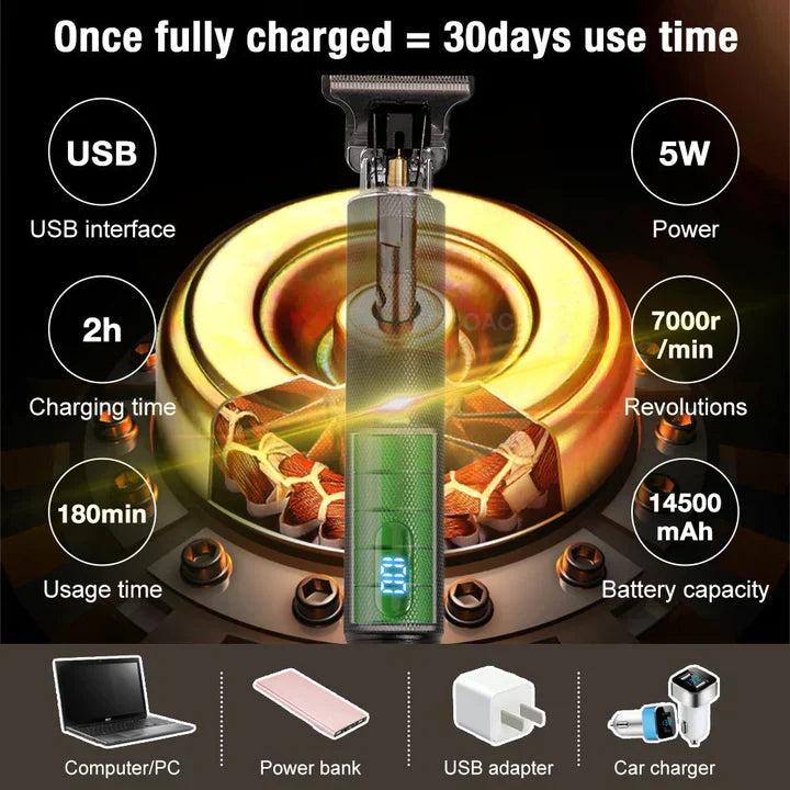 The Vintage T9 Hair Trimmer is the perfect solution for achieving a professional-looking trim at home or in the barbershop. Designed with precision technology, its thin and solid blades ensure smooth, even cuts without causing stubble or hair clogs. It’s safe for the skin, cutting hair without touching it, preventing irritation or pain. The trimmer features a quiet rotary motor, making it ideal for both thick and thin hair, and offers up to 3 hours of use with just a 30-minute charge. With a sleek bronze color, it’s suitable for both professional and household use. The package includes four clippers, oil, a cleaning brush, and a rechargeable battery, making it a convenient and efficient tool for any grooming routine.